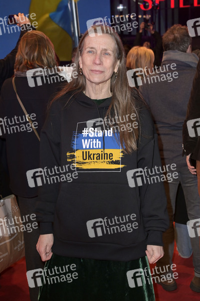 Mariette Rissenbeek demonstriert zusammen mit ukrainischen Filmemachern und Mitgliedern der Intarnationalen Jury ihre Solidarität mit der Ukraine auf dem Roten Teppich vor dem Berlinale-Palast auf der Berlinale 2023 / 73. Internationale Filmfestspiele Berlin. Berlin, 24.02.2023