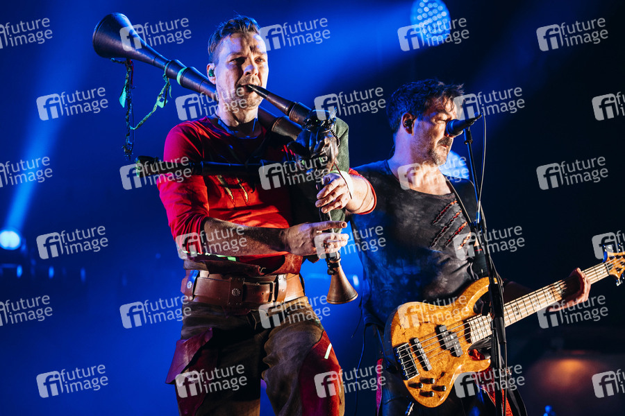 Flex der Biegsame / Marco Ernst-Felix Zorzytzky und Die Lutter / Kay Lutter von In Extremo live bei einem Konzert der 'Wolkenschieber'-Tour in der Messehalle. Erfurt, 29.12.2024