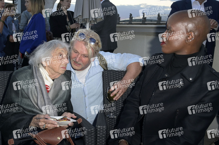 Margot Friedländer, Detlev Buck und Florence Kasumba beim Eröffnungsempfang der UFA Filmnächte 2024 auf der Dachterrasse der Bertelsmann Repräsentanz. Berlin, 21.08.2024