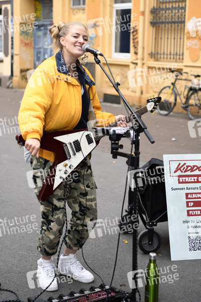 Kiddo Kat spielt ein Straßenkonzert im Rahmen ihrer Street Gig Tour während der Corona-Pandemie in der Limmerstraße. Hannover, 05.10.2020