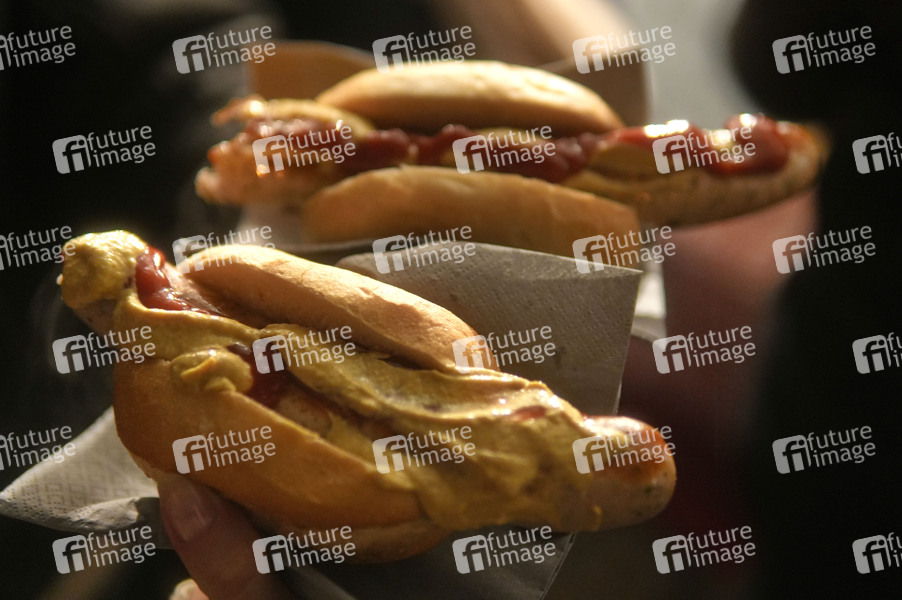 Bratwurst im Brötchen auf dem Alt-Rixdorfer Weihnachtsmarkt rund um den Neuköllner Richardplatz. Berlin, 08.12.2024