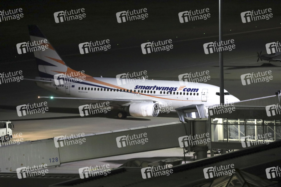 Eine Boeing 737 der Fluggesellschaft Smartwings landet nach 21 Uhr auf dem Flughafen Leipzig/Halle. Mit der Maschine sind auch ehemalige Ortskräfte deutscher Institutionen aus Afghanistan in Leipzig gelandet. Per Flugzeug werden ehemalige Ortskräfte sowie besonders gefährdete Menschen, etwa Menschenrechtsanwälte oder Frauenrechtlerinnen, nach Deutschland geholt. Leipzig, 16.04.2025
