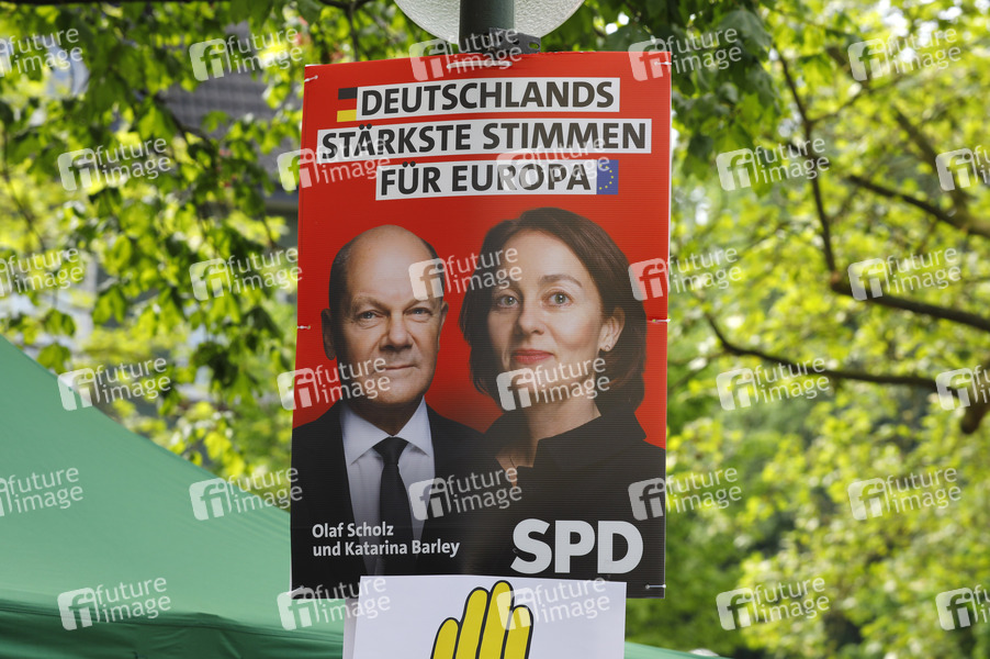 Wahlplakat der SPD zur Europawahl bei der DGB-Kundgebung zum 1. Mai unter dem Motto 'Mehr Lohn, mehr Freizeit, mehr Sicherheit' in der Fußgängerzone am Kiepenkerl. Waltrop, 01.05.2024