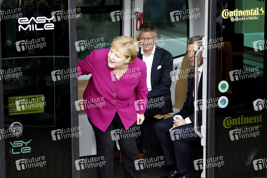 Elmar Degenhart und Angela Merkel im Continental Robo-Taxi-Cube beim Eröffnungsrundgang auf der Internationalen Automobil-Ausstellung 2019 auf dem Messegelände. Frankfurt am Main, 12.09.2019
