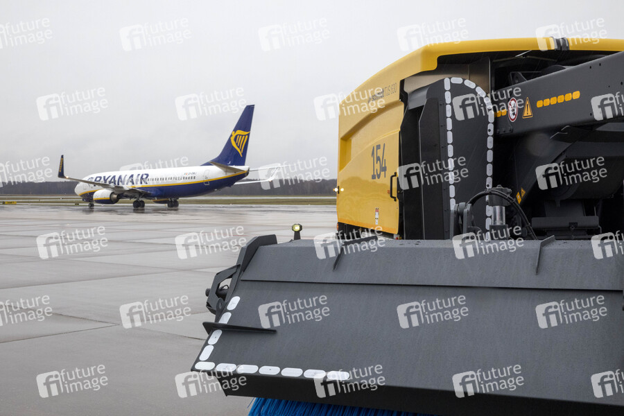Winterdienst-Saison, Kehrblasgeräte, Schneeschild, Flächenenteisung, Landebahn, Startbahn, Lande- und Startbahn, Aviation, Flugzeuge, Winter, Eis, Schnee, Hightech-Fahrzeuge, Flotte, Sprühfahrzeug, Winterdienst-Container, Regen, Schlechtes Wetter, Minusgrade, Temperaturfall