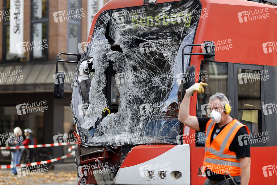 Bei einem schweren Straßenbahn-Unfall am Neumarkt zwischen zwei KVB-Zügen der Linien 1 und 7 sind 20 Menschen verletzt worden, eine Bahnfahrerin schwebt in Lebensgefahr. Als Ursache gilt derzeit eine fehlerhafte Weichenstellung. Köln, 02.11.2020