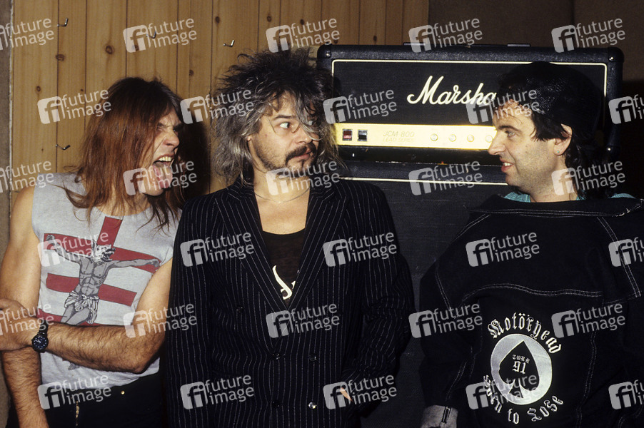 Michael 'Würzel' Burston, Phil 'Philthy Animal' Taylor und Phil 'Wizzö' Campbell von Motörhead bei einem Photoshooting im Tonstudio. London, 12.12.1991