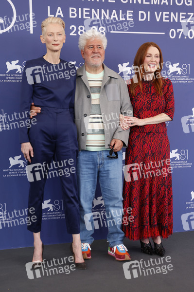 Tilda Swinton, Pedro Almodovar und Julianne Moore beim Photocall zum Kinofilm 'The Room Next Door' auf der Biennale di Venezia 2024 / 81. Internationale Filmfestspiele von Venedig im Palazzo del Casino. Venedig, 02.09.2024