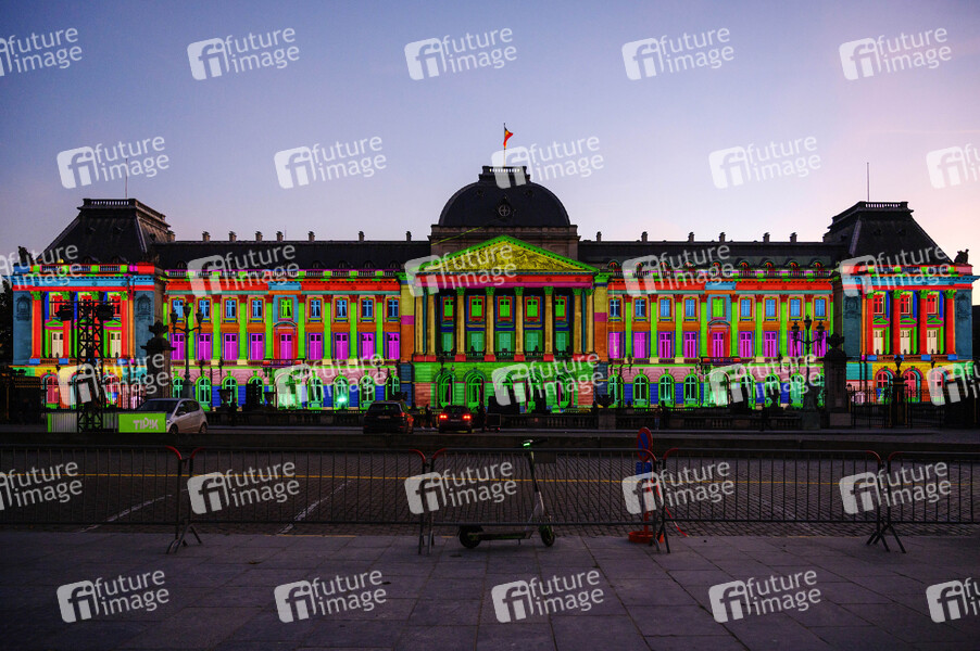 Der Königliche Palast beleuchtet mit bder Videokunst Performance 'Chiaroscuro - Dirty Monitor' im Rahmen des Events 'Bright Brussels'. Brüssel, 27.10.2021