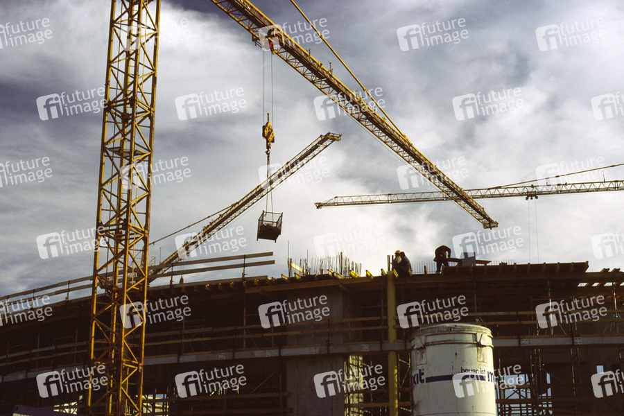 Bau, Baustelle, bauen, Bauarbeiter, Arbeiter, arbeiten, Arbeit, Kran, Krane, Hochbau, Beton, Transport, transportieren, heben, Last, Lasten, schweben, Aufbau, Konjunktur, Gefahr, gefaehrlich, Sicherheit, Arbeitsschutz, Helm, Helme, Staedtebau, Architektur
