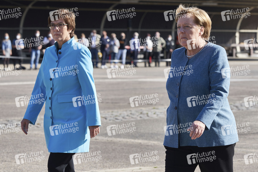 Verteidigungsministerin Annegret Kramp-Karrenbauer und Bundeskanzlerin Angela Merkel bei einem Appell für die Soldatinnen und Soldaten der Evakuierungsmission in Kabul und dem Feierlichen Gelöbnis von Rekruten des Fallschirmjägerregiments 31 in der Fallschirmjägerkaserne Seedorf. Seedorf, 22.09.2021