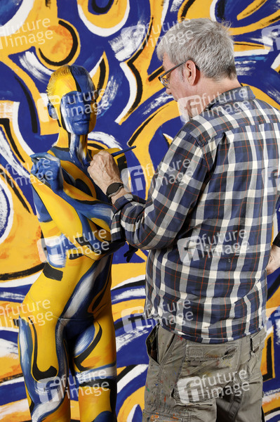 Bodyart: Blau-Gelb Splash Performance mit Model Anastasia im Atelier Düsterwald. Hameln, 22.08.2024 - BodyArt-Künstler: Jörg Düsterwald