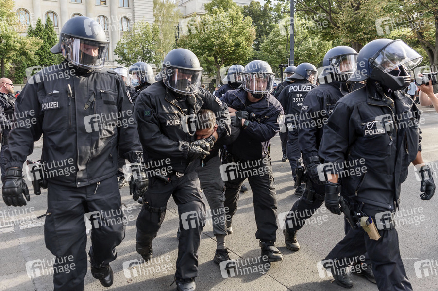 Coronaleugner, Verschwörungstheoretiker und rechte Gruppen der Initiative Querdenken protestieren mit einer Großdemonstration gegen die bestehenden Maßnahmen zur Eindämmung der Corona-Pandemie. Vor der russischen Botschaft an der Straße Unter den Linden kam es zu Auseinandersetzungen mit Polizeikräften. Hier sprach auch Vegan-Koch Attila Hildmann zu den Demonstranten und wurde anschließend festgenommen. Wegen Nichteinhaltung der polizeilichen Auflagen wurde die Demonstration durch die Polizei beendet. Berlin, 29.08.2020