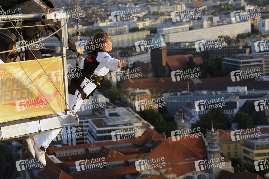 Base Flying von Jochen Schweizer mit den Hauptdarstellern von 'Gangs' auf dem Park Inn Hotel am Alexanderplatz in Berlin