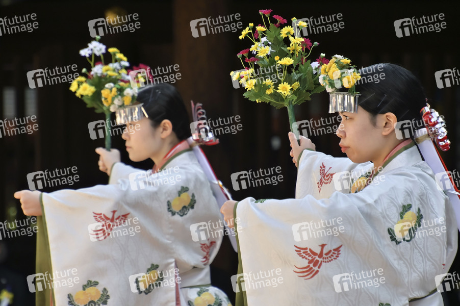 Schreinjungfrauen bei der Zeremonie zum 100. Jahrestag des Meiji-Schreins. Tokio, 01.11.2020