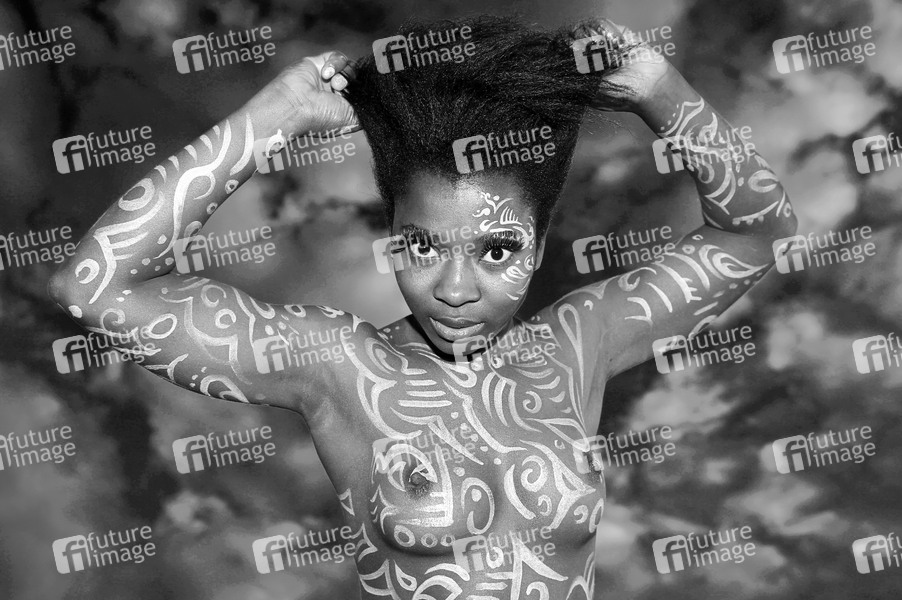 Bodypainting, Erotik, Frau, Mädchen, Afrikanerien, nackt, draußen, weiblich, Körperkunst, Kunst, Ornamente, Malerei, Feld, Acker, Stoppelfeld, Heuballen, Stroh, Landwirtschaft, Ernte, Abendsonne, erotic, African woman, girl, nude, outdoor, female, body art, body painting, ornaments, field, hay, straw, farming, harvest, evening sun