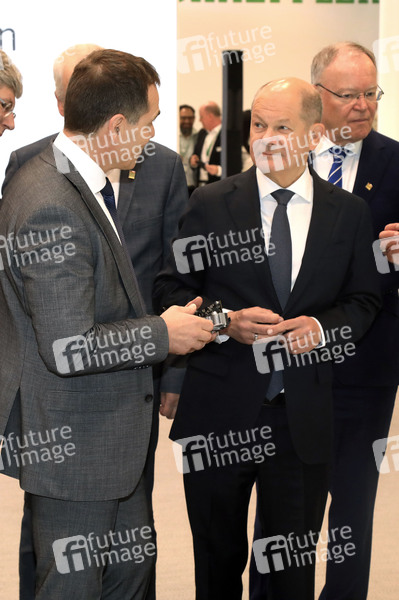 Olaf Scholz und Stephan Weil am Stand der Firma Schaeffler beim Eröffnungsrundgang auf der Hannover Messe 2025 auf dem Messegelände. Hannover, 31.03.2025