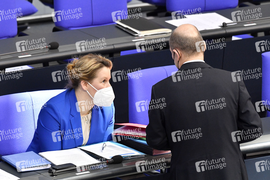 Franziska Giffey und Olaf Scholz in der 210. Sitzung des Deutschen Bundestages im Reichstagsgebäude. Berlin, 12.02.2021