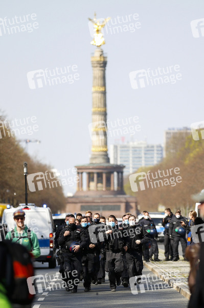 Tausende Demonstranten haben sich am Mittwoch auf der Straße des 17. Juni versammelt, um gegen die staatliche Corona-Politik zu protestieren. Wegen vielfacher Verstöße gegen die Corona-Auflagen wurde die Demo von der Polizei aufgelöst. Berlin, 21.04.2021