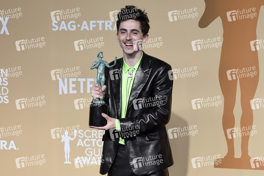 Timothee Chalamet mit dem Preis für den besten Kin-Hauptdarsteller in 'Like a Complete Unknown' beim Preisträger-Photocall der 31. Screen Actors Guild Awards 2025 im Shrine Auditorium and Expo Hall. Los Angeles, 23.02.2025