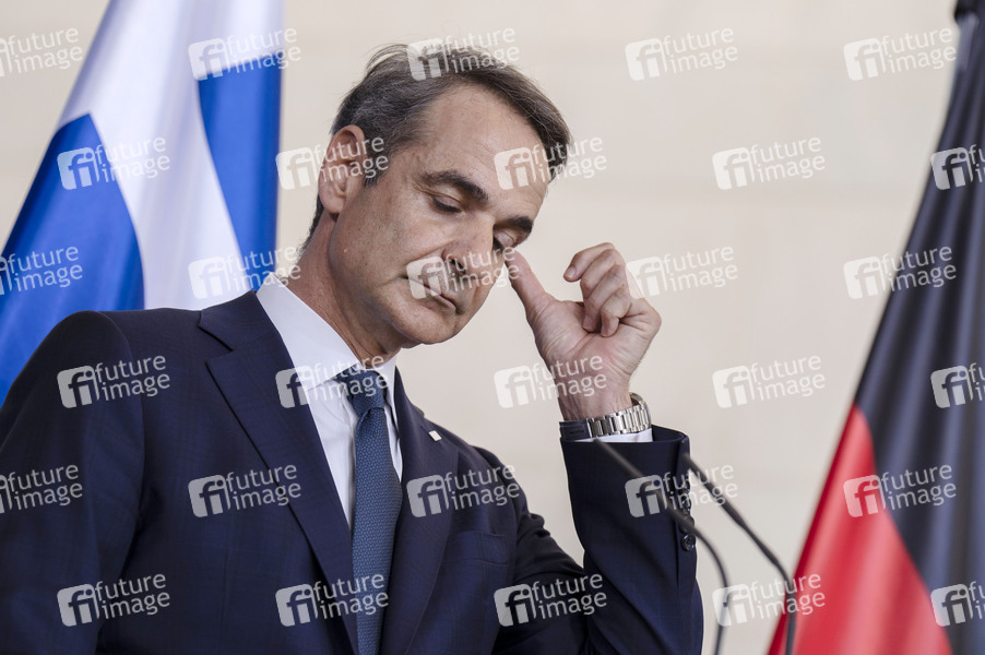 Kyriakos Mitsotakis beim Empfang des Ministerpräsidenten von Griechenland mit militärischen Ehren und zu einem gemeinsamen Gespräch mit dem Bundeskanzler mit anschließendem Pressestatement im Bundeskanzleramt. Berlin, 13.05.2025