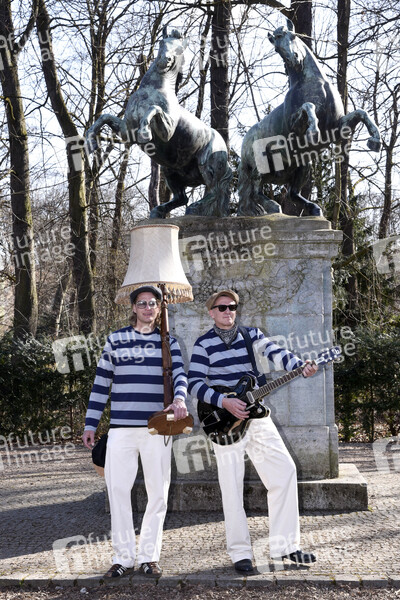Guido und Günter von der Guten A-Band beim Videodreh zum Lied 'Radlg'fahrn und G'schmissn' der Guten A-Band im Bavariapark und auf der Theresienwiese. München, 26.03.2021