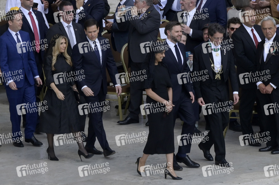 Marco Rubio mit Ehefrau Jeanette Dousdebes Rubio und J.D. Vance mit Ehefrau Usha Vance bei der Amtseinführung von Papst Leo XIV. auf dem Petersplatz. Vatikanstadt, 18.05.2025