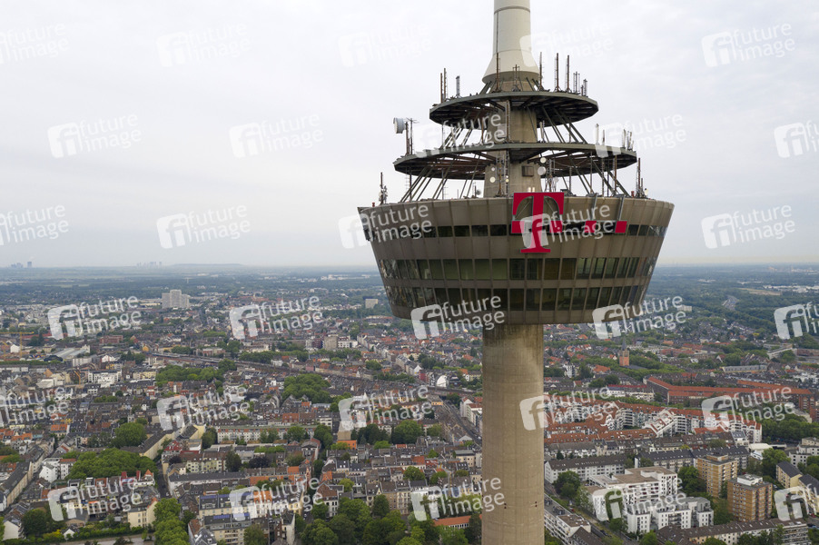 Der Kölner Fernsehturm Colonius (Entwurf: Erwin Heinle, Konstruktion: Fritz Leonhardt) mit der markanten Telekom-Werbung gesehen von Osten aus. Köln, 03.06.2020