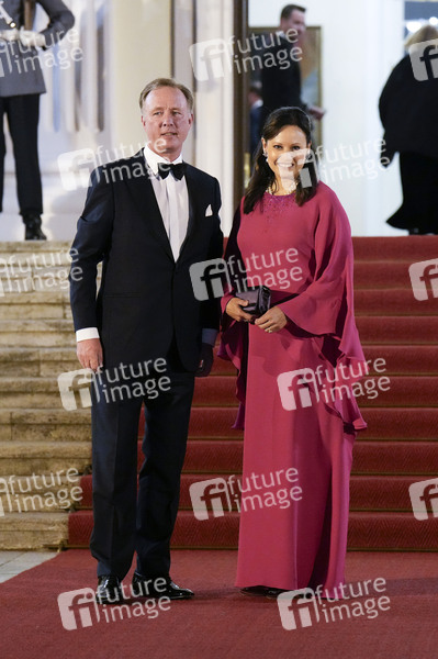 Gustav Prinz zu Sayn-Wittgenstein-Berleburg mit Partnerin Carina Axelsson bei der Ankunft zum Abendessen anlässlich des 25. Jubiläums der Nordischen Botschaften im Schloss Bellevue. Berlin, 21.10.2024