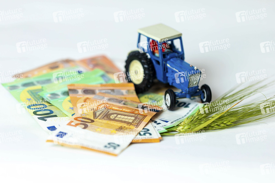 Landwirt, Landwirte, Bauer, Bauer, Subventionen, Unterstützung, Agrarsubventionen, Kompensation, Investitionsunterstützungen, garantierte Abnahmepreise, Nahrungsmittel, Agrikultur, Agrarwesen, Tierhaltung, Agrarprodukte, Tierprodukte, landwirtschaftlichen Nutzfläche, Agrarökologie, nachhaltige Landwirtschaft, Geld, Banknoten, Geldscheine, Euro, €, Geldscheine, Trecker, Traktor, Gerste, Getreide, Agrardiesel, Symbolbild, Themenbild