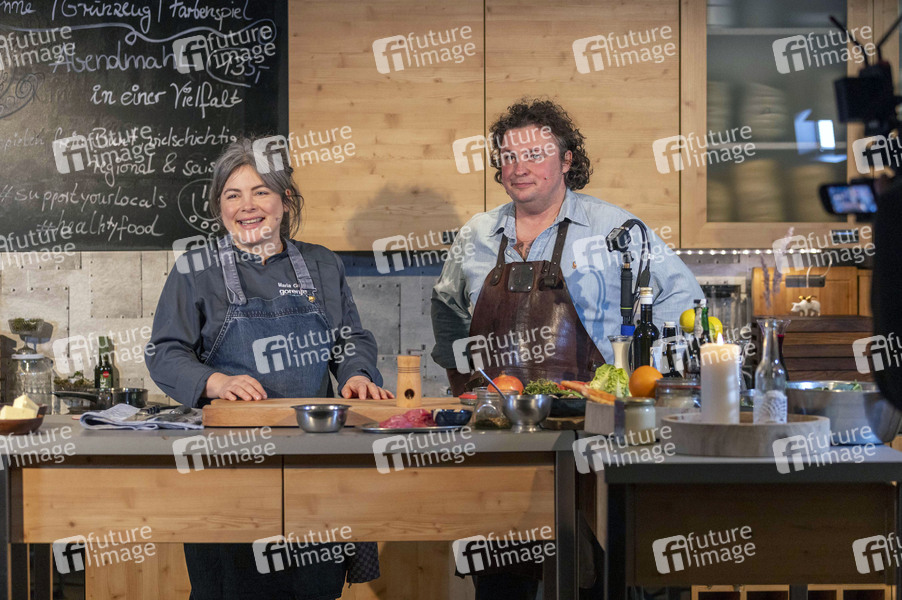 Die TV-Köchin Maria Groß (Maria Ostzone) und Ehemann Matthias Steube bereiten im Live-Stream ein 3-Gänge-Menü in der Showküche ihres Restaurants Bachstelze. Bischleben, 25.01.2022