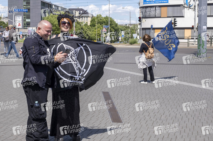 Teilnehmer des 28. Wave-Gotik-Treffens beim nicht ganz ernst gemeinten Marsch für Satan anlässlich des zeitgleichen Umzugs evangelikaler Christen unter dem Motto Marrsch für Jesus durch die Innenstadt. Leipzig, 08.06.2019