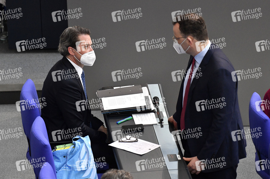 Andreas Scheuer und Jens Spahn in der 216. Sitzung des Deutschen Bundestages im Reichstagsgebäude. Berlin, 05.03.2021