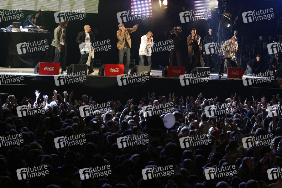 Culcha Candela live beim Coca Cola 'Soundwave 2007' vor dem Brandenburger Tor in Berlin. Die Sänger Jonny Strange (Uganda), Larsito (Kolumbien), Itchyban (Polen), Lafrotino (Kolumbien), Mr. Reedoo (Deutschland), Don Cali (Kolumbien) und DJ Chino con Estilo (Republik Korea)