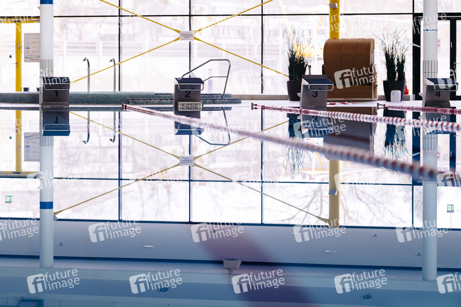 Das Wasser im Schwimmerbecken im Hallenbad am Lentpark liegt ruhig. Aufgrund der Coronakrise und dem damit verbundenden Lock Down und Corona-Maßnahmen sind derzeit die Bäder der KölnBäder GmbH geschlossen. (Themenbild, Symbolbild) Köln, 25.02.2021