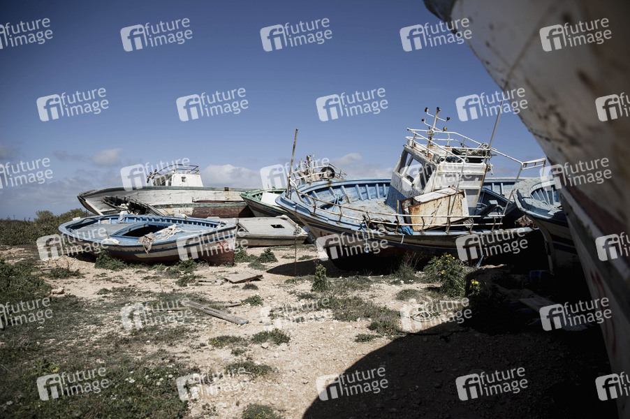 Alte Holzboote und Rettungswesten, mit denen Flüchtlinge über das Mittelmeer geflohen sind, liegen auf einem Schiffsfriedhof auf Lampedusa (Italien). Die Schiffe stammen von autonomen Landungen auf der Insel. Lampedusa, 05.03.2020