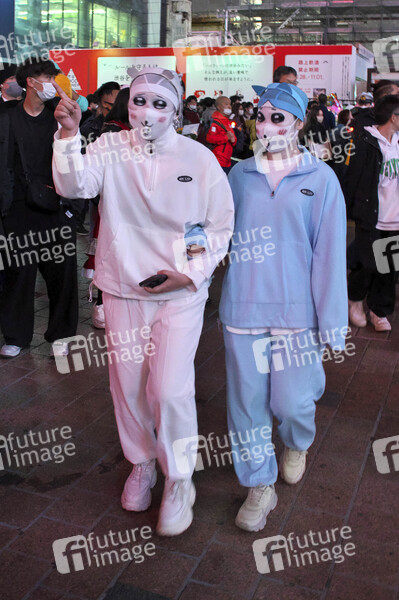 Kostümerte feiern Halloween im Stadtteil Shibuya. Die Sicherheitsvorkehrungen für das Halloween-Event, wenige Tage nach der Massenpanik in der südkoreanischen Stadt Seoul, wurden verschärft. Tokio, 31.10.2022