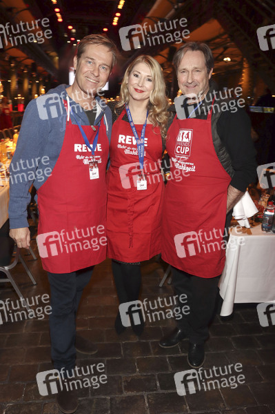 Hinnerk Baumgarten, Sandra Quadflieg und Helmut Zierl bei der Charity-Weihnachtsfeier 'Mehr als eine warme Mahlzeit' für Obdachlose in der Fischauktionshalle. Hamburg, 03.12.2019