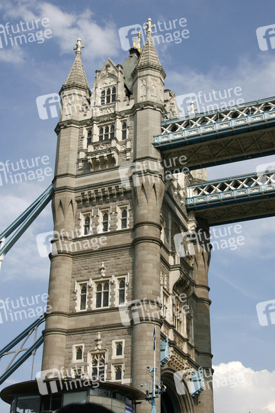 Klappbrücke, Neugotik, 244 Meter lang, Höhe der Brückentürme 65 Meter, die Fahrbahn zwischen den 61 Meter voneinander entfernten Türmen liegt neun Meter über dem Fluss, Fußgängerbrücke in 43 Meter Höhe, die beiden Baskülen können bis zu einem Winkel von 83 Grad hochgeklappt werden, Architekt Horace Jones, erbaut 1886 bis 1894, Themse