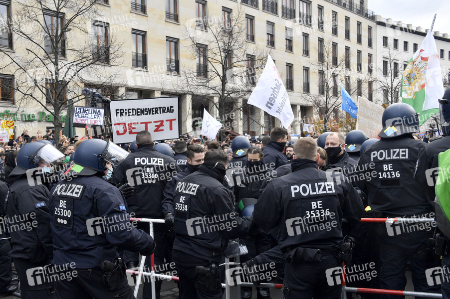 Tausende Demonstranten protestieren am Brandenburger Tor und im Regierungsviertel gegen die Corona-Politik der Regierung. Wegen der massenhaften Verstöße gegen die Hygieneauflagen droht die Polizei mit Auflösung der Versammlung. Das Gelände vor dem Bundestag ist abgesperrt, dort sind Proteste verboten. Berlin, 18.11.2020