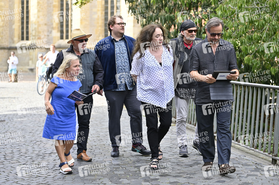 ChrisTine Urpruch, Axel Prahl, Björn Meyer, Mechthild Großmann, Claus D. Clausnitzer und Jan Josef Liefers beim Presserundgang 'Spurensuche Tatort Münster' an original Drehorten mit dem Tatort-Cast zum 20 jährigen Jubiläum des Münsteraner Tatorts. Münster, 30.08.2022