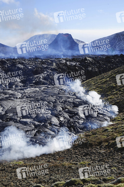 Spalteneruption am Berg Fagradalsfjall auf der Halbinsel Reykjanes im Südwesten Islands. Die Lava fließt in das Tal Geldingadalur. Besucher können das Gebiet bereten. Die Sicherheit wird durch Rettungsteams, Wissenschaftler und Polizei gewährleistet, die das Gebiet bei Gefahr sperren. Grindavik, 23.03.2021
