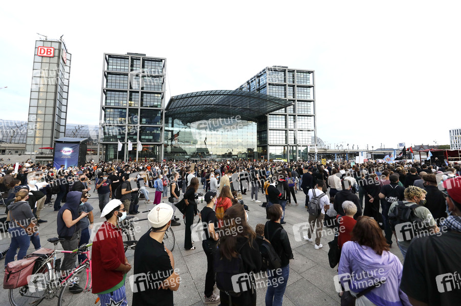 Tausende Demonstranten fordern die sofortige Aufnahme von Flüchtlingen aus dem von einem Grossbrand zerstörten griechischen Flüchtlingslager Moria (Lesbos) bei einer Demonstration unter dem Motto 'Evakuiert die Lager, denn #WirHabenPlatz' vom Bündnis 'Seebrücke' am Hauptbahnhof. Berlin, 09.09.2020