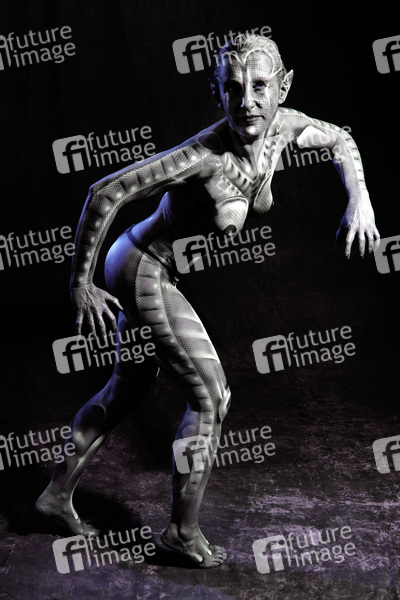 Bodypainting, Erotik, Frau, nackt, drinnen, weiblich, Monster, Außerirdische, Alien, Echse, Körperkunst, Kunst, Malerei, monochrom, erotic, woman, nude, indoor, female, monochrome, lizard, body art, body painting
