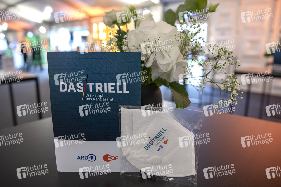 Aufsteller mit Mundschuchutz 'Das Triell' beim 'Triell - Dreikampf ums Kanzleramt' von ARD und ZDF mit den Kanzlerkandidaten im Studio Berlin-Adlershof. Berlin, 12.09.2021