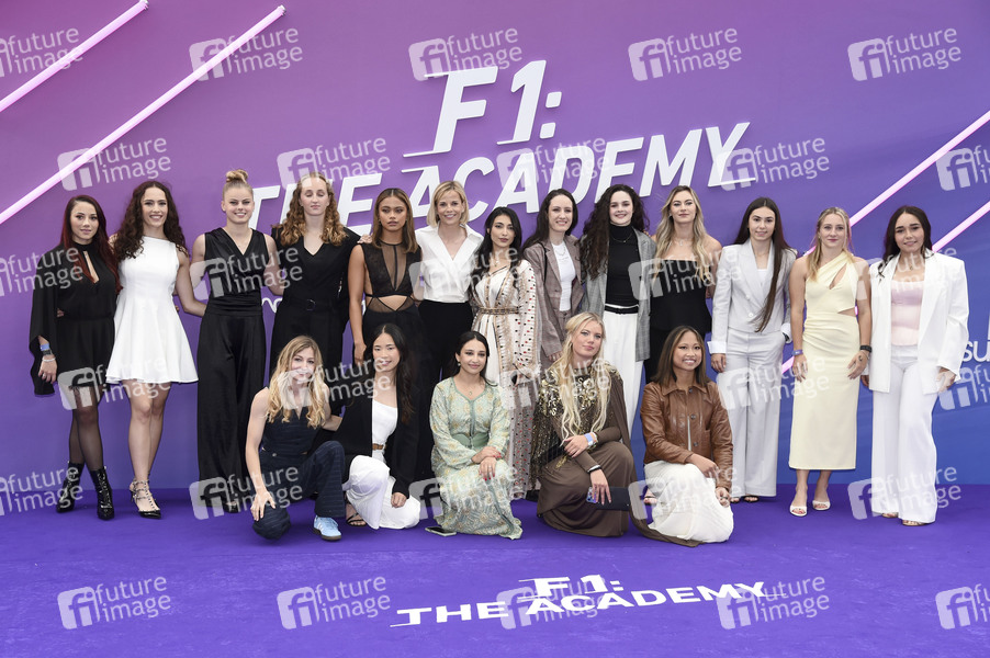 Emma Felbermayr, Tina Hausmann, Maya Weug, Doriane Pin, Bianca Bustamante, Chloe Chung, Susie Wolff, Alisha Palmowski, Emely de Heus, Abbi Pulling, Hamda Al Qubaisi, Ella Lloyd, Amna Al Qubaisi, Lola Lovinfosse, Chloe Chambers, Nicole Havrda und Aiva Anagnostiadis bei der Premiere der Netflix Dokuserie 'F1: The Academy' im Cineworld Leicester Square. London, 27.05.2025
