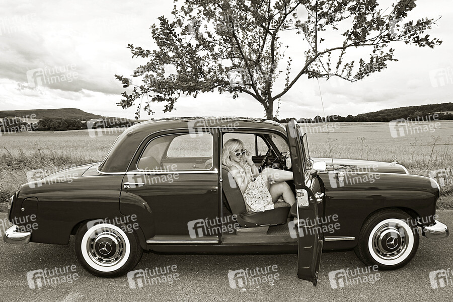 SOLsnap Cover-Model September 2011, Auto, Oldtimer, Mercedes-Benz Ponton 190 b Baujahr 1961, Erotik, sexy, Lolita, Sonnenbrille, Lolli, Lutscher, Sommerkleid