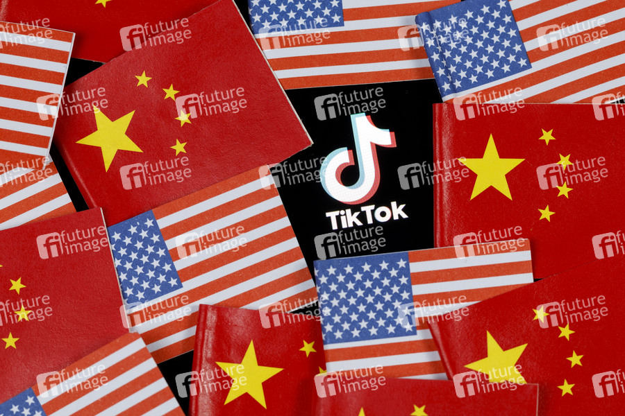 Das Logo der Video-App Tiktok auf einem Bildschirm umringt von chinesischen und US-Flaggen. Ein Richter hat Donald Trumps TikTok-Verbot für unwirksam erklärt. (Symbolfoto, Themenfoto)