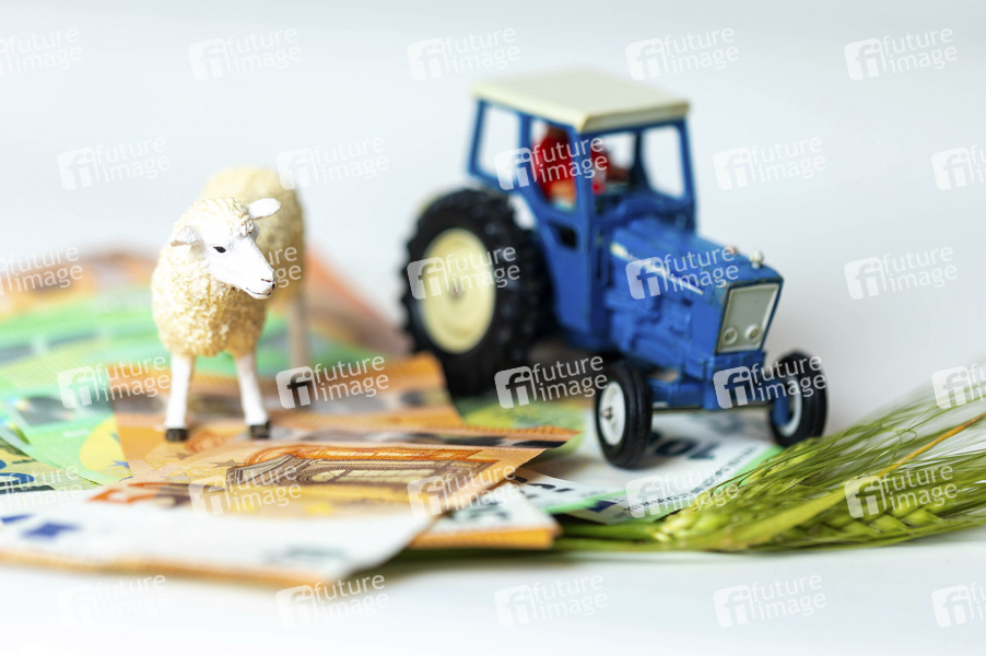 Landwirt, Landwirte, Bauer, Bauer, Subventionen, Unterstützung, Agrarsubventionen, Kompensation, Investitionsunterstützungen, garantierte Abnahmepreise, Nahrungsmittel, Agrikultur, Agrarwesen, Tierhaltung, Agrarprodukte, Tierprodukte, landwirtschaftlichen Nutzfläche, Agrarökologie, nachhaltige Landwirtschaft, Geld, Banknoten, Geldscheine, Euro, €, Geldscheine, Trecker, Traktor, Schaf, Gerste, Getreide, Agrardiesel, Symbolbild, Themenbild