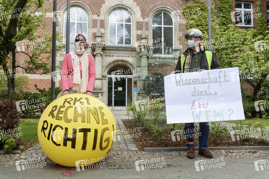 Circa 10 Personen protestieren vor dem Robtert-Koch-Institut in Berlin gegen die 'falschen Zahlen', die das RKI angeblich heraus gibt und stellen die Corona-Eindämmungmaßnahmen in Frage. Berlin, 16.05.2020